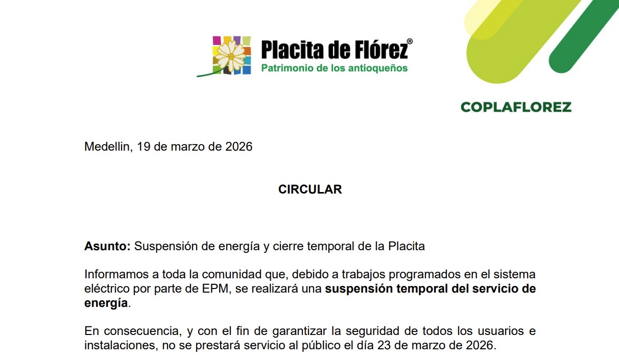 SUSPENSIÓN DE ENERGÍA Y CIERRE TEMPORAL DE LA PLACITA DE FLÓREZ EL LUNES 23 DE MARZO DE 2026